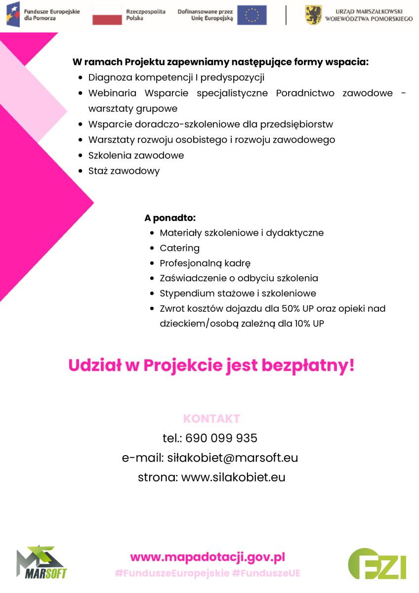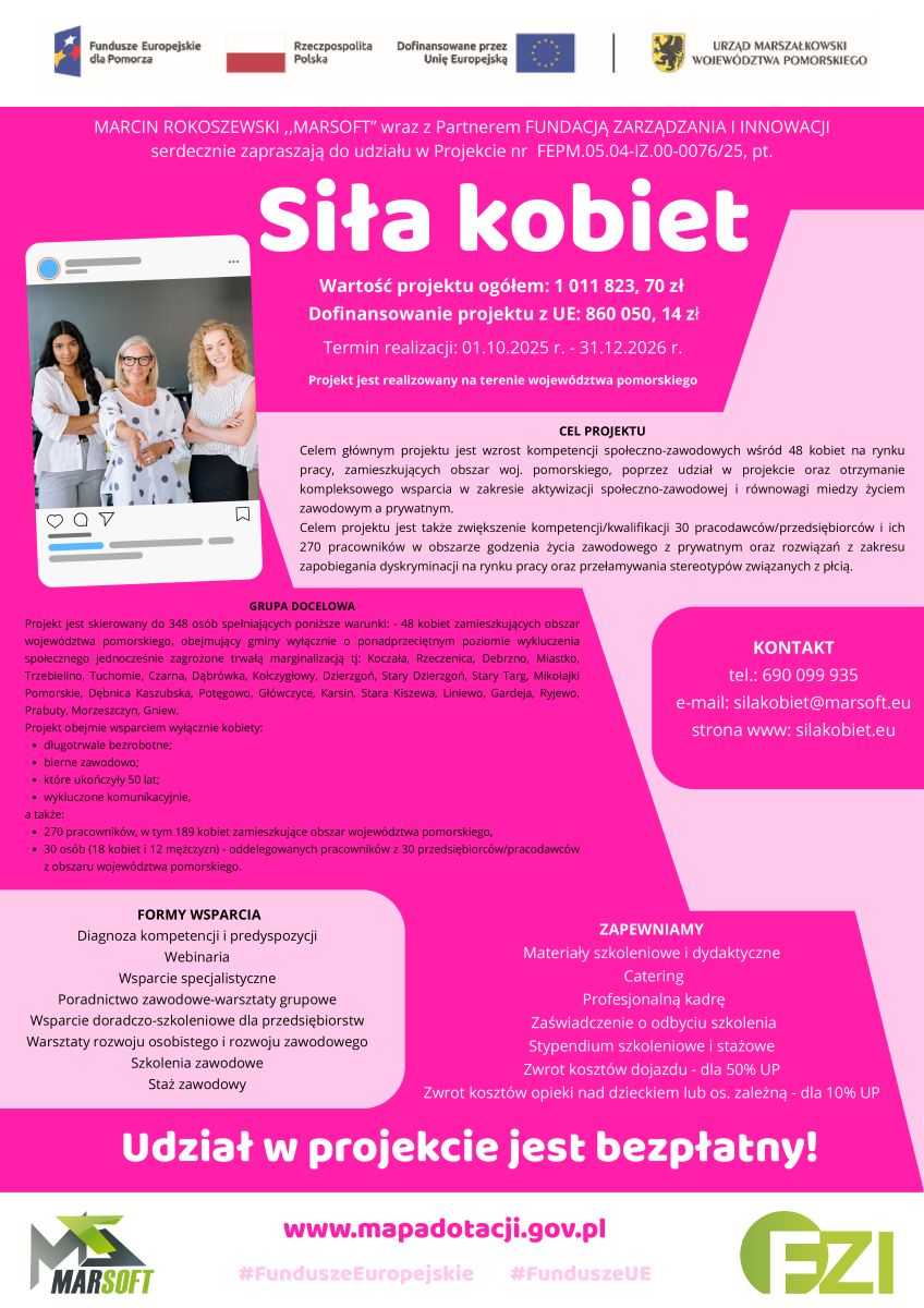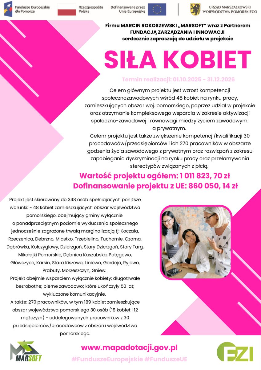 Informujemy o rozpoczęciu realizacji projektu „Siła kobiet”, nr FEPM.05.04-IZ.00-0076/25, realizowanym na terenie województwa pomorskiego. Projekt współfinansowany jest ze środków Europejskiego Funduszu Społecznego Plus, w ramach programu Fundusze Europejskie dla Pomorza 2021-2027, Priorytet V: Fundusze Europejskie dla silnego społecznie Pomorza, Działanie 5.4 Kobiety na rynku pracy.